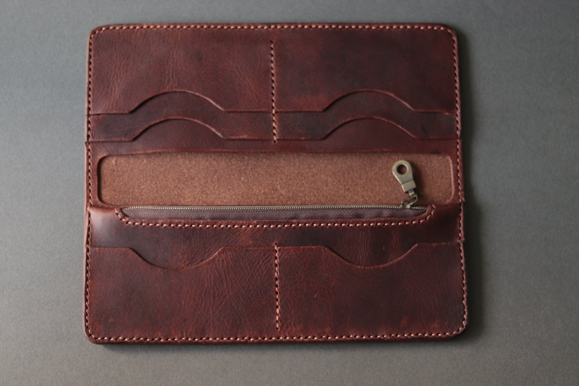 This expertly crafted women's leather long wallet features durable hand-stitching and offers organized storage for 6 to 12 cards. It includes three dedicated slots for cash or receipts and a secure zipper compartment, providing both functionality and sophistication. Its thoughtful design ensures easy access to essentials while maintaining a refined, timeless look.